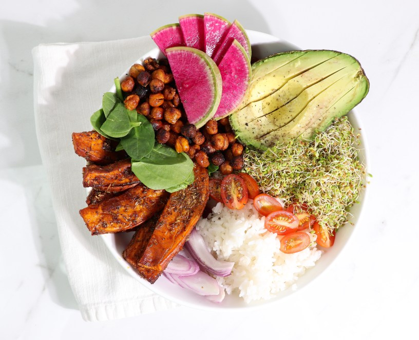 - Divide rice or quinoa between serving bowls and pile on the cooked kale, sweet potato, chickpeas and onion. Top with Red Clover sprouts, radish slices, and avocado halves. Drizzle tahini dressing on top and sprinkle sesame seeds, if desired.