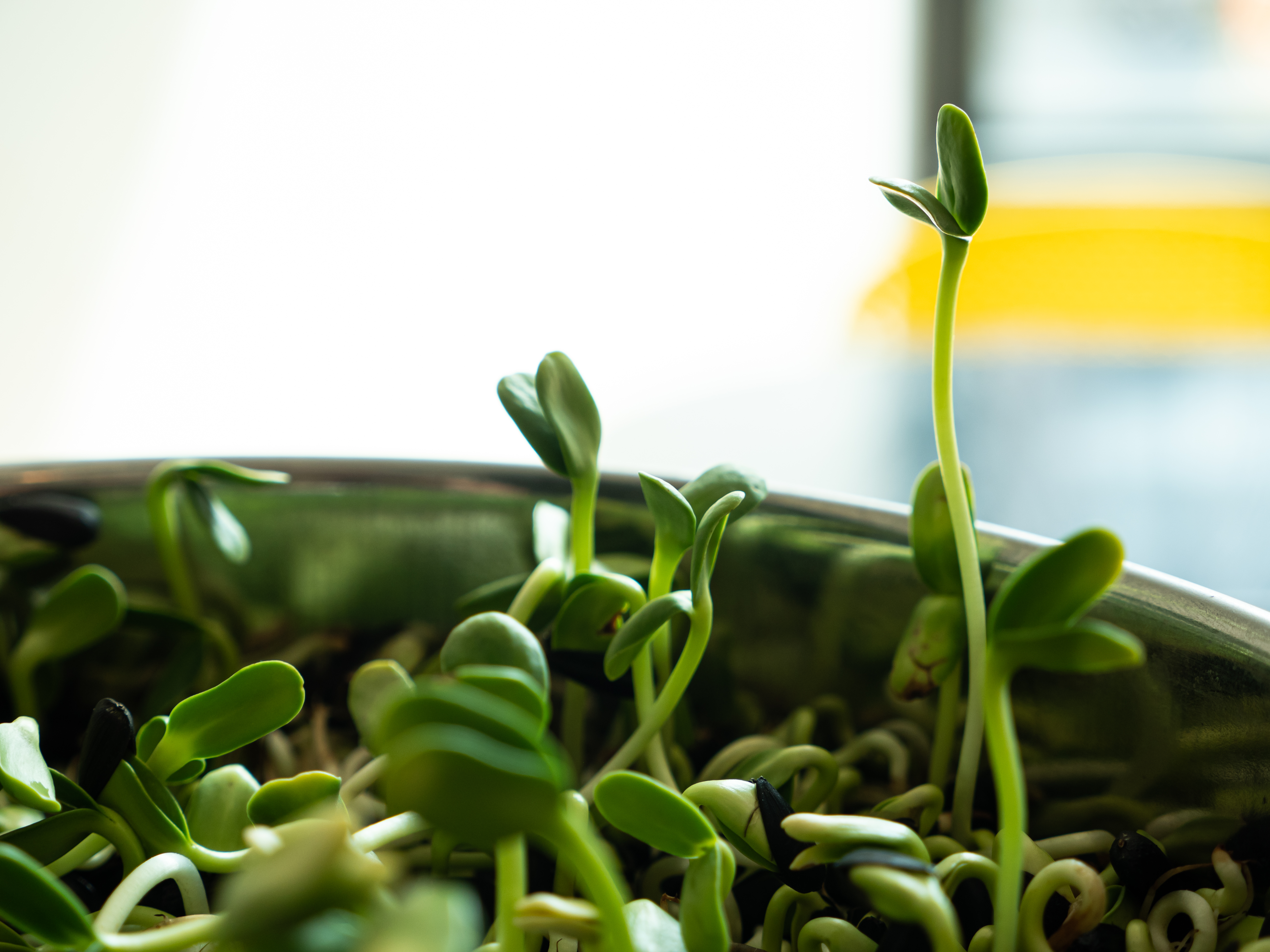 That’s when it becomes a microgreen. Microgreens have developed leaves, need growing medium like soil, and are generally trimmed from their roots before they’re eaten. They’re more delicate and leafy than sprouts and can be grown for up to 3 weeks.